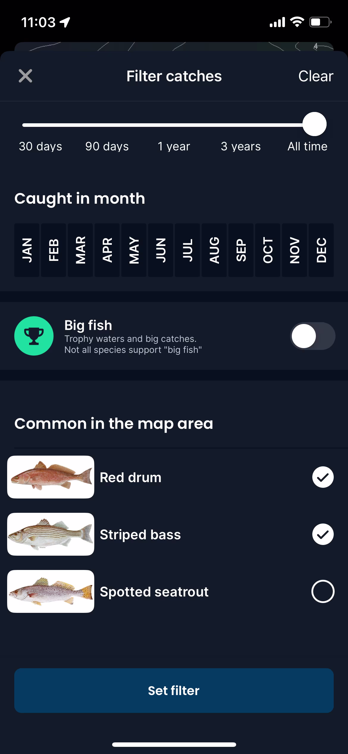 Your honey hole could be made up of several seasonal spots. Fish often move into new water as seasons change. Water levels drop in the summer, so fish move into deeper water. In fall, when water temps drop, fish will move to shallower, warmer water. Make sure to filter catches on the map for these different times of years to pattern different clusters, then look how some clusters move with different seasons.